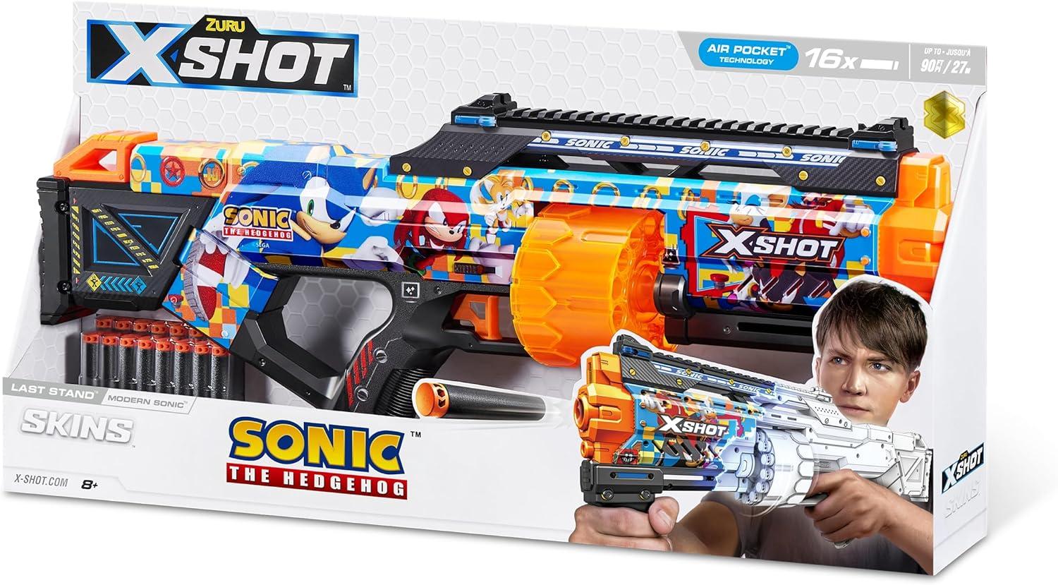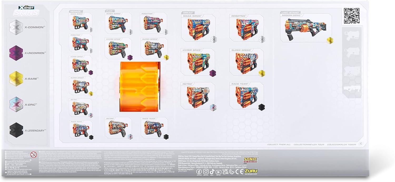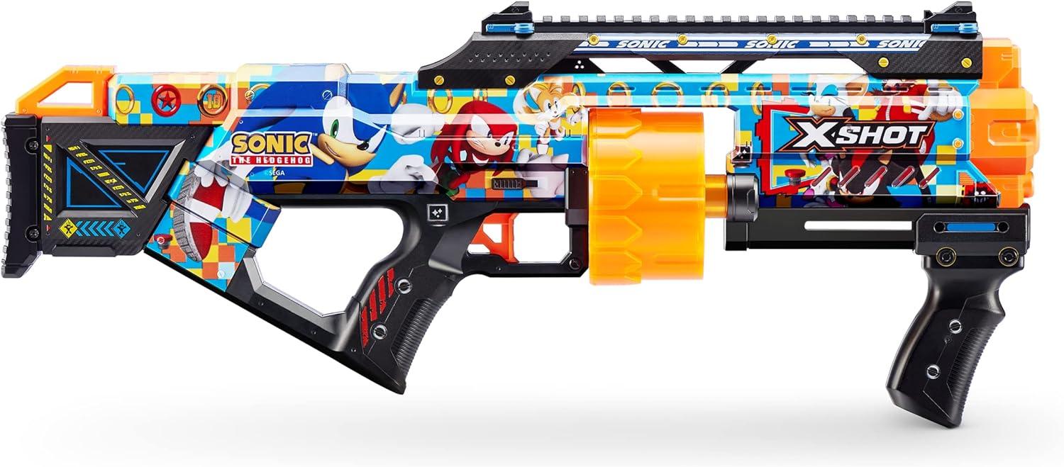 Skin your blaster with the super sonic speed of Sonic the Hedgehog! With a 14-dart capacity auto-rotating barrel you can hit multiple targets up to 27m / 90 feet away. Unleash 14 darts in seconds thanks to its Slam Fire action. The Last Stand comes with a tactical grip and rail for easy loading and allows you to add accessories to your blaster to level up. Hunt for all 6 Sonic the Hedgehog Skins and find the rare blasters, will you discover the X-Legendary Skin, with only a 1 in 1000 chance of being found. Choose different, choose X-Shot Skins.
