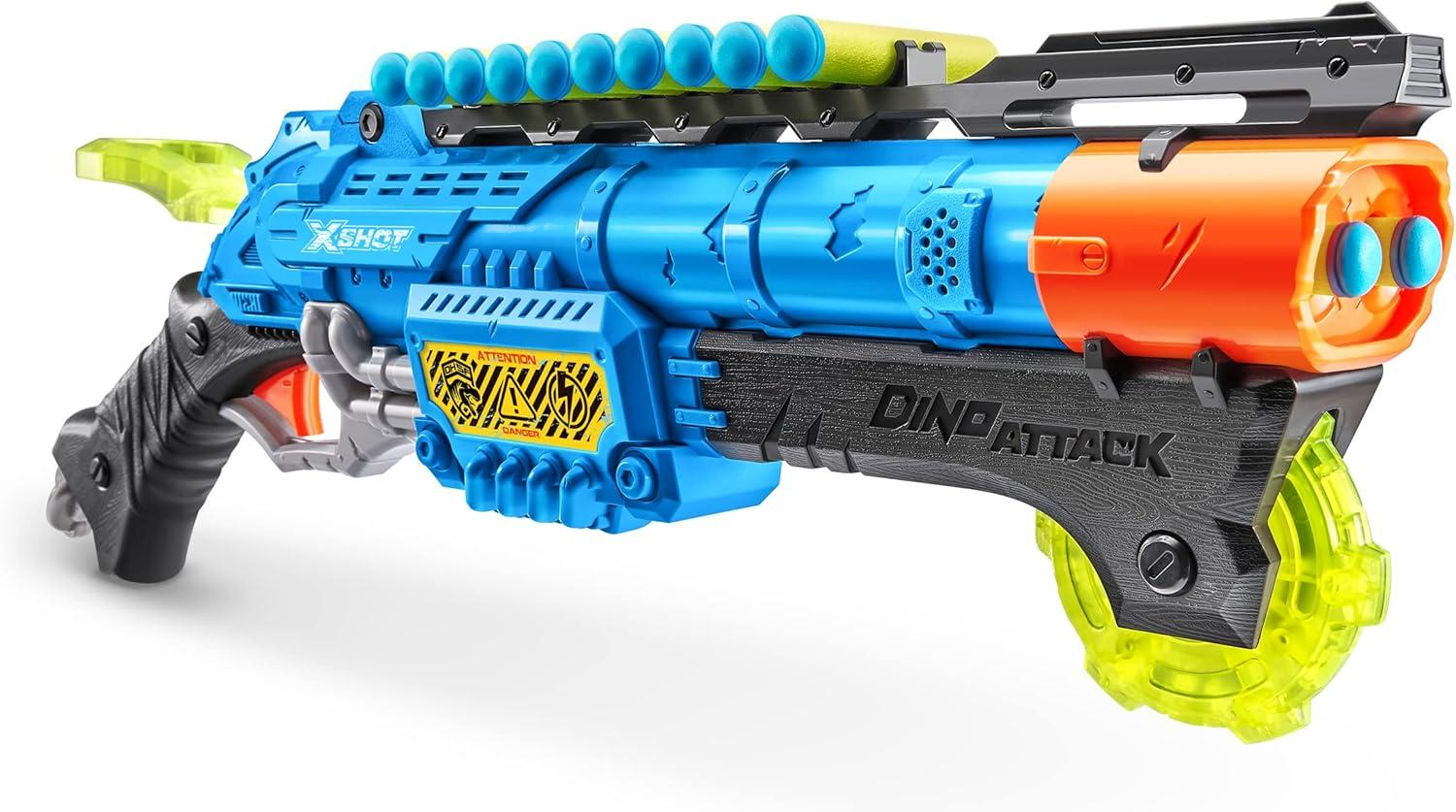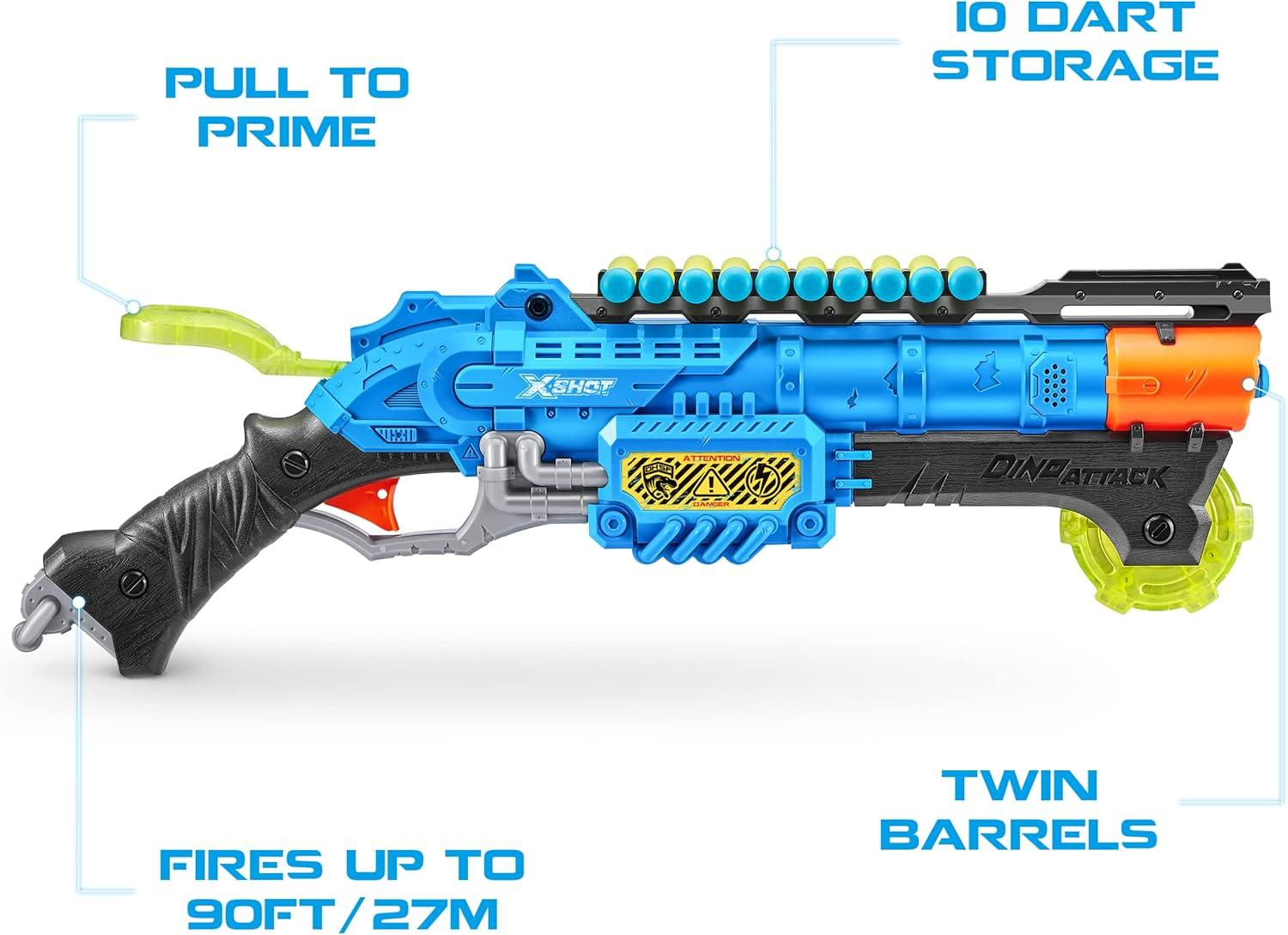 The Dinos are ready to attack – fight back with X-Shot Dino Attack Claw Hunter! Use the twin barrel shot-gun style blaster and become a Dino destroyer, blasting Dinos from up to 27m / 90 feet away! Never miss a chance to strike with the 2 dart capacity twin barrels and additional 10 dart storage on top! Hunt Dinos and destroy them before it's too late with the X-Shot Dino Attack Claw Hunter!