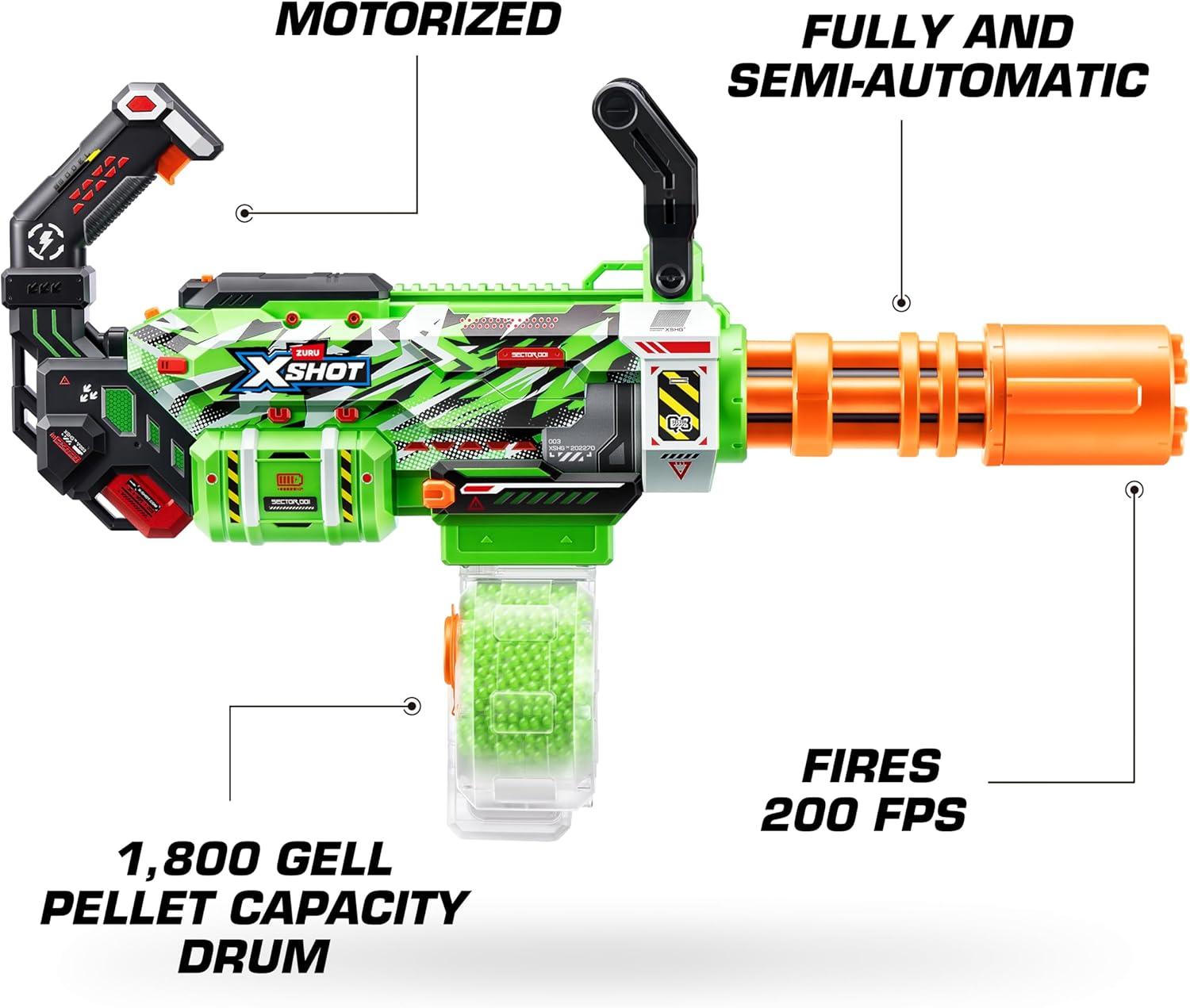 Redefine excitement and power with the XSHOT Hyper Gel Gatling Blaster. Engineered for maximum impact, this motorized blaster propels gel pellets at an impressive speed of 200fps, ensuring your opponents feel the intensity of every shot. Simply add water to the gel pellets to transform them into gellets, perfect for thrilling battles. The Hyper Gel Gatling boasts a rapid-fire mechanism, allowing for continuous firing to dominate any blaster showdown. Whether you're engaging in friendly competition or orchestrating elaborate tactical missions, the XSHOT Hyper Gel Gatling is your ultimate partner in gel-blaster warfare. Perfect for outdoor or open spaces, the blaster is designed for ages 14+. The gatling blaster enhances performance due to its unique gatling design for round after round play. Prepare yourself for unparalleled epic battles, as this cutting-edge blaster combines innovation and fun in one striking package. With the Hyper Gel Gatling's impressive glow-in-the-dark gellet capacity of 1,800 rounds, you'll remain a formidable force from dawn till dusk and beyond.