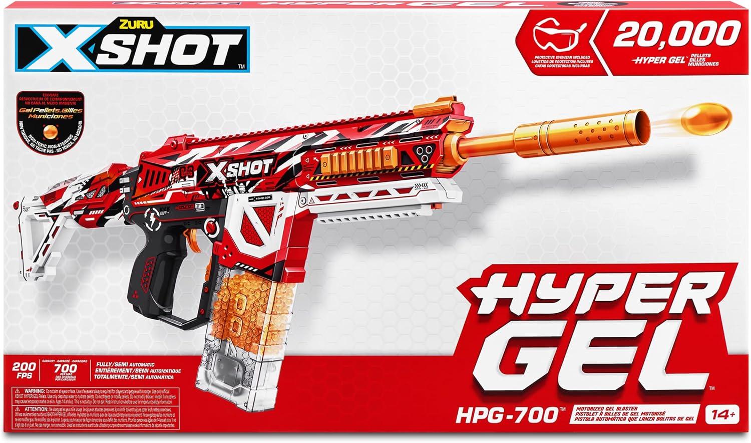 It's time to get hyped up with X-Shot Hyper Gel! The X-Shot Hyper Gel Trace Fire can blast Hyper Gel Pellets at 170 feet per second with its motorized fully and semi automatic modes. The Trace Fire has a 600 Pellet capacity hopper, when you run out of Gel Pellets simply flip your blaster to reload from the 850 Pellet capacity mag. This motorized Gel Blaster comes with a rechargeable battery. Stocked with 10,000 Hyper Gel Pellets and protective eyewear, just add water to start the ultimate Gel Blaster battle!