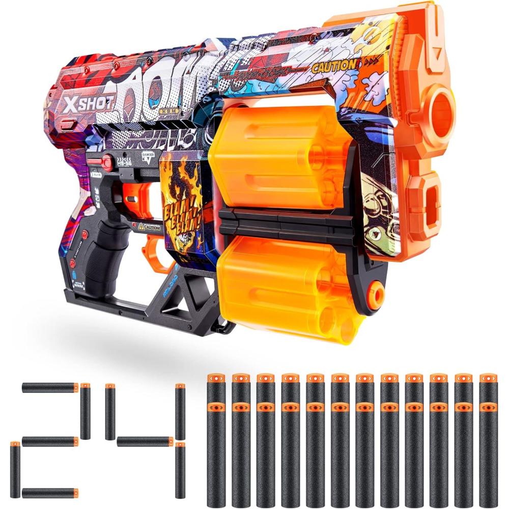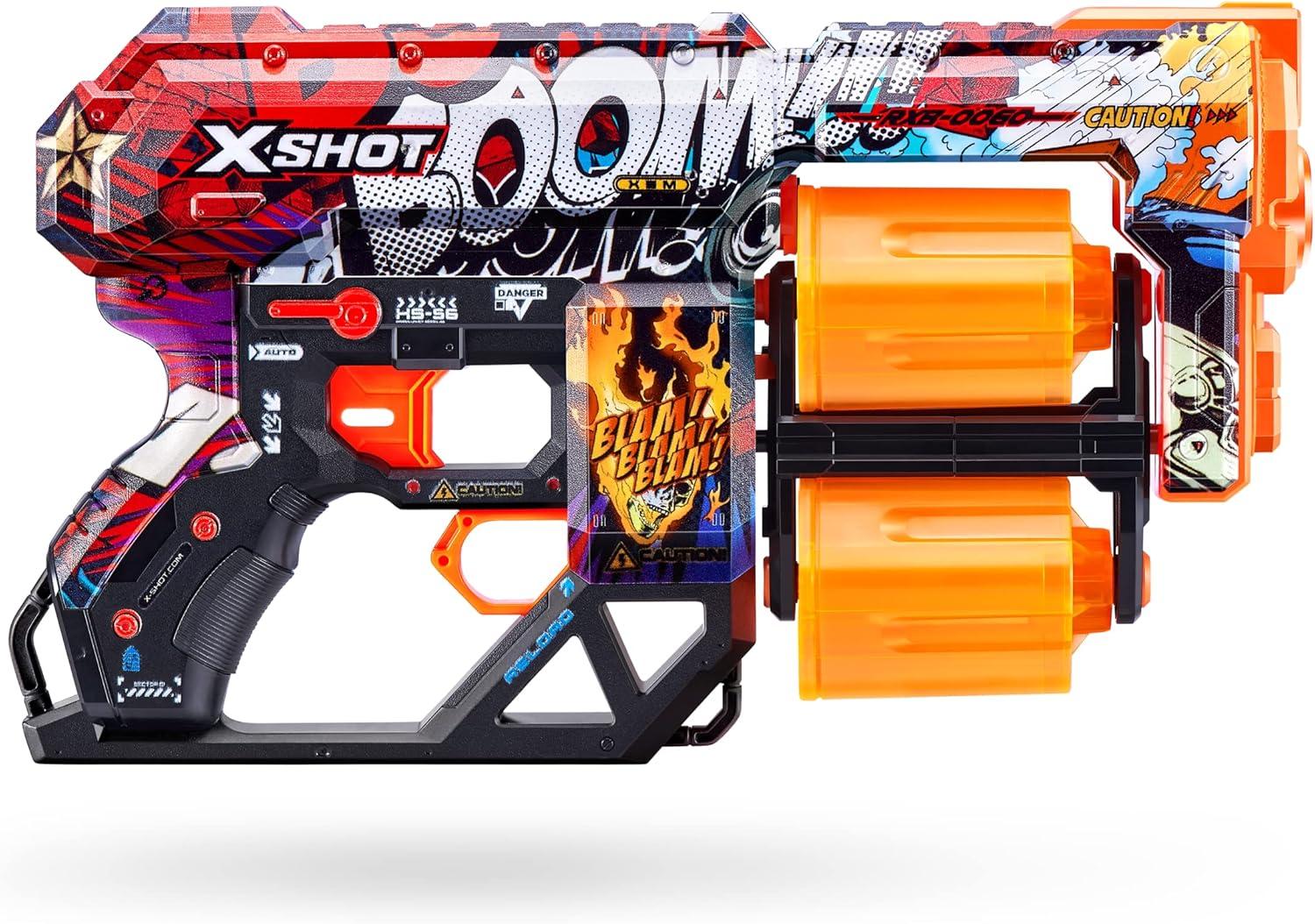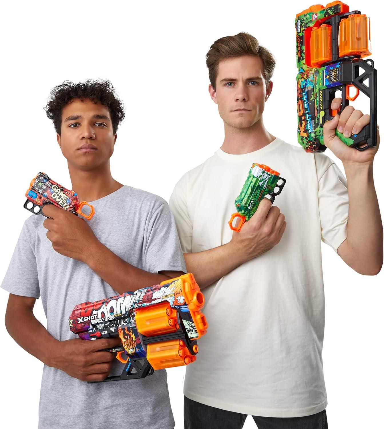 X-Shot Skins brings the in-game experience of skinning your blaster into the real world, choose your Skin and join the battle. Get ready for mayhem with the X-Shot Skins Dread. With a 12-dart capacity, the Dreads’ double trouble rotating barrels mean you are locked and loaded for fun. When you run out of darts in one barrel, switch over to the second one and blast the competition from up to 27m / 90 feet away. X-Shot Skins darts include new air pocket technology for a faster, further, and more accurate shot. The X-Shot Skins Dread blaster comes in 7 unique skins to select and collect, to build your ultimate armoury. Choose different, choose X-Shot Skins.